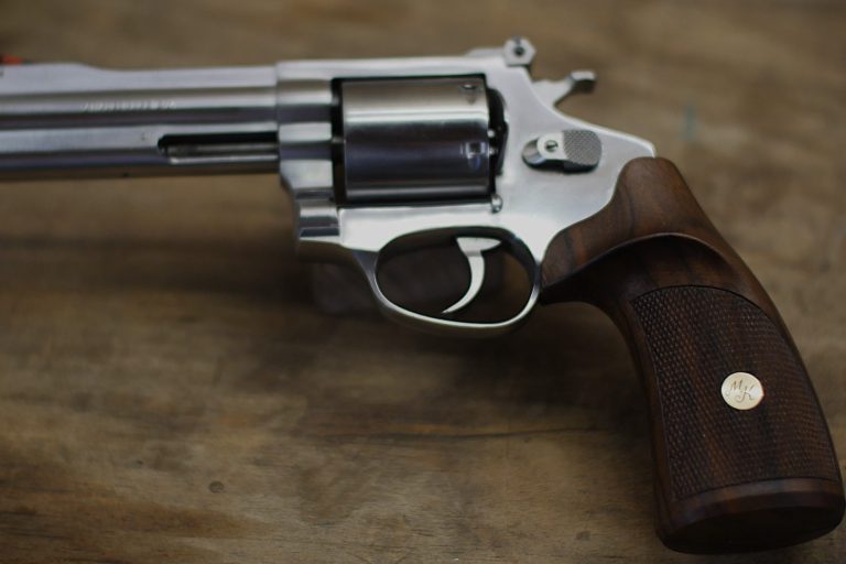 Handgefertigte Revolvergriffschalen mit Fischhaut und Monogrammplättchen sind nur ein Beispiel verschiedener Schaftarbeiten, die wir anbieten.
